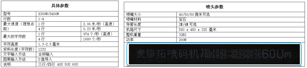 8300W白墨小字符噴碼機(jī) 是一款專門為線纜行業(yè)提供完美標(biāo)識解決方案的白墨噴碼產(chǎn)品,可以在這些產(chǎn)品上進(jìn)行生產(chǎn)日期、保質(zhì)期、批號、文字、圖案、條碼等可變信息的噴印。標(biāo)準(zhǔn)功能中文全拼輸入(支持一、二級字庫) 通過U盤導(dǎo)入圖案:資料存儲在U盤 通過U盤進(jìn)行軟件升級 單獨按鈕啟動與停機(jī)停機(jī)自動進(jìn)行噴嘴清洗 全自動故障檢測系統(tǒng)及故障信息顯示 菜單式信息制作與編輯 標(biāo)準(zhǔn)PC的QWERTY鍵盤 高度背光式液晶顯示屏(960*300) 噴碼機(jī)操作狀態(tài)顯示-4個發(fā)光二極管