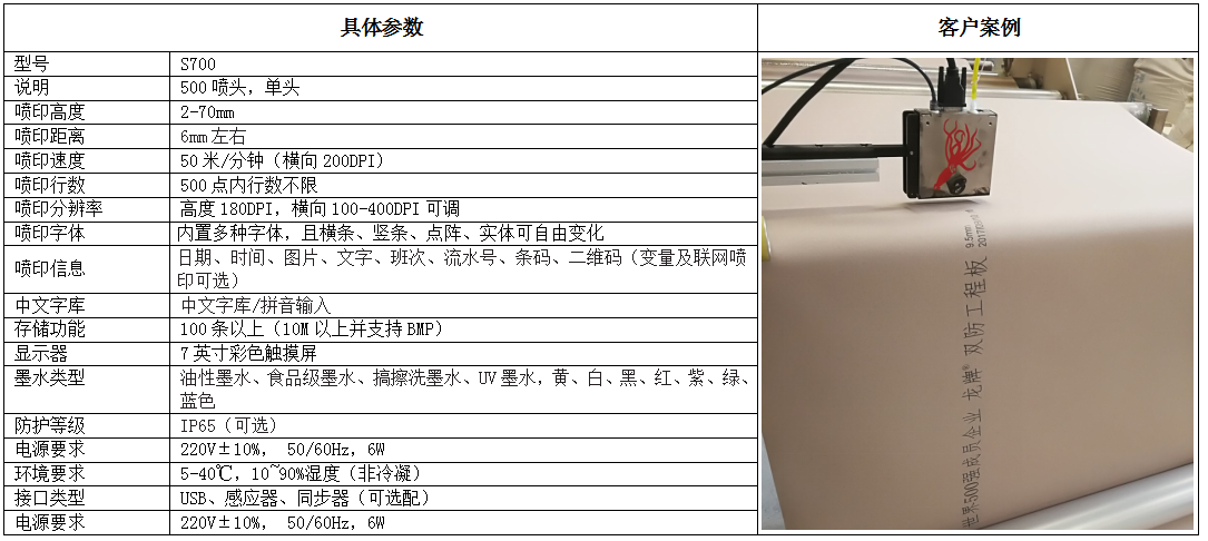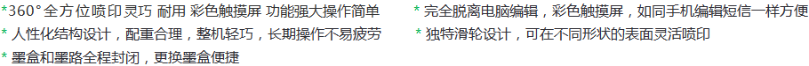 賽爾S700高解析噴碼機 穩(wěn)定可靠,防堵設計,不易堵塞,減少擠墨次數(shù);噴頭多重保護,避免噴頭外殼表面因刮、擦、撞引發(fā)的噴頭損傷,確保長時間無故障運行,與其它同類噴碼機相比,工作可靠性大大提高。各種顏色墨水,在不同產(chǎn)品表面上進行無接觸噴印,標識清晰美觀,附著力強。S700噴碼機正廣泛應用在化工、建材、鋼管、飲料、食品、管材、線纜、汽配、日化、化妝品、醫(yī)藥、橡膠、郵政等行業(yè)。賽爾S700高解析噴碼機特點* 噴印信息所見即所得,內(nèi)置海量中文字庫;點陣字體,橫條狀字體,豎條狀字體,印刷字體,字符高度和點大小任意設置,獨有防偽字體滿足防竄貨等多方需求
